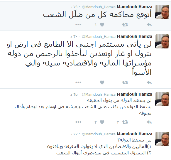 وأشار “حمزة” عبر سلسلة تغريدات على حسابه بموقع التدوين المصغر “تويتر” إلى أن إسقاط الدوله يعود إلى المسؤول المتسبب في سوء صرف أموال الشعب والاقتصاديين الذين لا يقولون الحقيقة وينافقون.