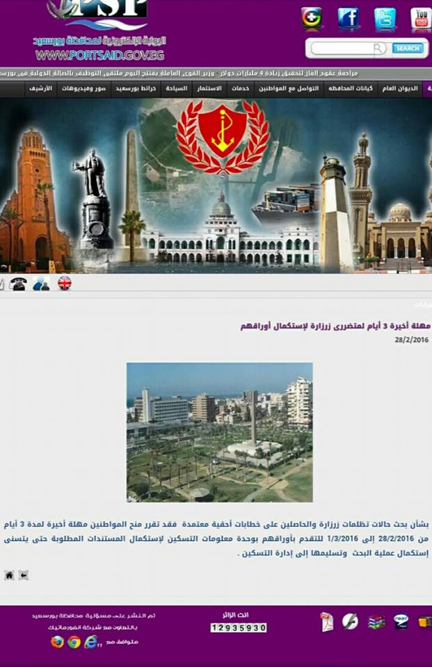 “بشأن بحث حالات تظلمات زرزارة والحاصلين على خطابات أحقية معتمدة فقد تقرر منح المواطنين مهلة أخيرة لمدة 3 أيام من 28/2/2016 إلى 1/3/2016 للتقدم بأوراقهم بوحدة معلومات التسكين لاستكمال المستندات المطلوبة حتى يتسنى استكمال عملية البحث وتسليمها إلى إدارة التسكين”.