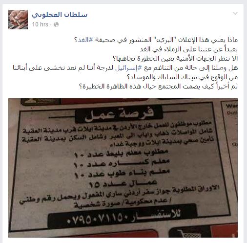 انتقد سلطان العجلوني عميد الأسرى الأردنيين في السجون الإسرائيلية، نشر جريدة “الغد” الأردنية إعلانا عن طلبات استقدام عمالة أردنية للعمل في مدينة إيلات الإسرائيلي، وذلك عبر صفحته الشخصية بموقع التواصل الاجتماعي “فيس بوك”.