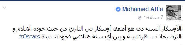 وقال -عبر منشور له على “فيس بوك”-: “الأوسكار السنة دي هو أضعف أوسكار في التاريخ من حيث جودة الأفلام والترشيحات.. قارن بينه وبين أي سنة هتلاقي فجوة شديدة”.