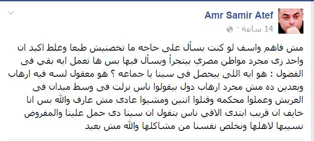 تساءل المؤلف وكاتب السيناريو، عمرو سمير عاطف، عن ما يحدث في سيناء، مستنكرًا أن يستمر الإرهاب هناك حتى الآن؛ حيث قال -في منشور له على “فيس بوك”-: “مش فاهم وآسف لو كنت بسأل على حاجة ما تخصنيش طبعًا وغلط أكيد إن واحد زيي مجرد مواطن مصري بيتجرأ ويسأل فيها، بس هاتعمل إيه بقى في الفضول: هو إيه اللي بيحصل في سينا يا جماعة؟”.