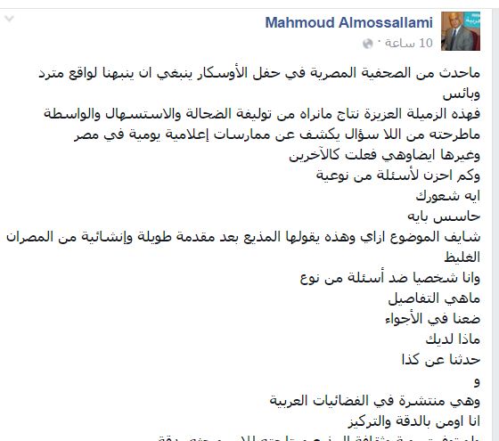 وأعرب “المسلمي” -عبر “تويتر”- عن أسفه من إلقاء بعض الصحفيين أسئلة من قبيل “إيه شعورك؟ حاسس بإيه؟ شايف الموضوع ازاي؟”، مشيرًا إلى أن هذه الأسئلة “يقولها المذيع بعد مقدمة طويلة وإنشائية من المصران الغليظ”.