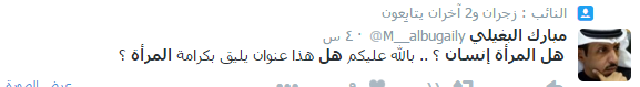 واعتبر الإعلامي السعودي مبارك البغيلي، أن عنوان الندوة لا يليق بكرامة المرأة، وكتب عبر حسابه على موقع التواصل الاجتماعي تويتر “هل المرأة إنسان؟ بالله عليكم هل هذا عنوان يليق بكرامة المرأة؟”.