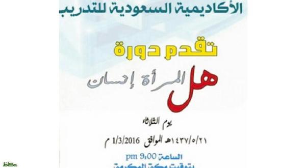 وتبادل مرتادو مواقع التواصل الاجتماعي صورة لإعلان دورة مقدمة من الأكاديمية السعودية للتدريب والاستشارات بعنوان “هل المرأة إنسان” يلقيها المدرب فهد الأحمدي.