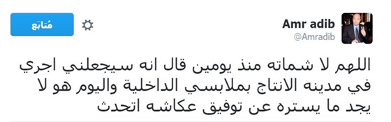 وقال عمرو أديب -في تغريدة له على “تويتر”-: “اللهم لا شماتة، منذ يومين قال إنه سيجعلني أجري في مدينة الإنتاج بملابسي الداخلية.. واليوم هو لا يجد ما يستره.. عن توفيق عكاشة أتحدث”.