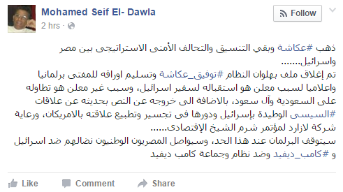 واختتم “سيف الدولة” منشوره مؤكدًا أن البرلمان سيتوقف عند هذه الخطوة ضد عكاشة، لكن المصريين سيواصلون نضالهم ضد إسرائيل، ونظام كامب ديفيد.