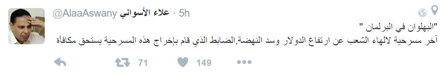 وقال -في تغريدة له على “تويتر”-: “البهلوان في البرلمان.. آخر مسرحية لإلهاء الشعب عن ارتفاع الدولار وسد النهضة، الضابط الذي قام بإخراج هذه المسرحية يستحق مكافأة”.