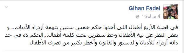وقالت -في منشور لها على “فيس بوك”-: “في قضية الأربع أطفال اللي أخدوا حكم خمس سنين بتهمة ازدراء الأديان… وبغض النظر عن نية الأطفال وحط سطرين تحت كلمة أطفال… الحكم ده في حد ذاته ازدراء للأديان والدستور والقانون وأخطر بكتير من تصرف الأطفال”.