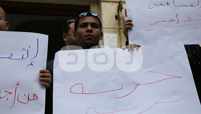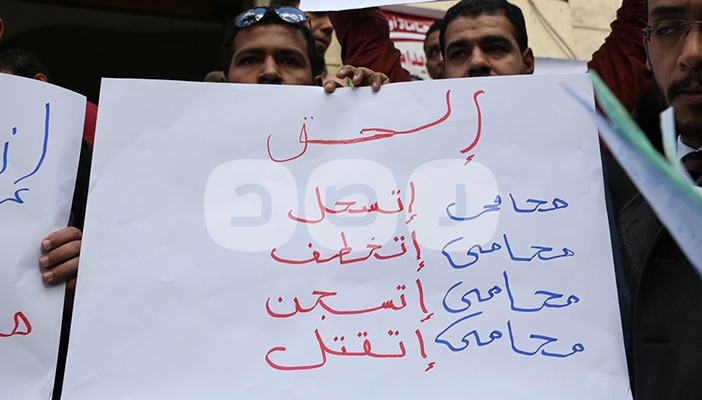 أقام عدد من المحامين اليوم الخميس، وقفة احتجاجية أمام نقابة المحاميين، للمطالبة بإيقاف الاختفاء القسري والتعدي على المحامين