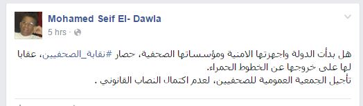 وأشار “سيف الدولة” في تعليقه إلى أن ما تمر به نقابة الصحفيين يعد حصارا لها من أجهزة الدولة الأمنية؛ عقابًا لها على الخروج عن الخطوط الحمراء.