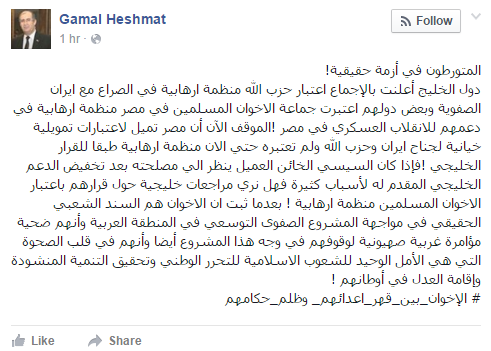 حيث قال حشمت في منشور له على صفحته الشخصية على موقع “فيسبوك”: “إن إعلان دول الخليج بالإجماع اعتبار “حزب الله” منظمة “إرهابية”، في إطار صراعها مع إيران الصفوية، وأتعجب من أن بعض تلك الدول اعتبرت جماعة الإخوان المسلمين في مصر منظمة “إرهابية” في دعمهم للعسكر”.