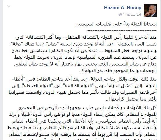 وتابع “حسني”: “كل تلك الاتهامات والإهانات التي صارت توجهها قوى الرفض في المجتمع للدولة لا للنظام، كان يمكن إعفاء الدولة منها لو تواضع رأس الدولة قليلًا وأدرك أنه أيضًا رأس النظام السياسي، وأن الأخطاء التي يرتكبها هي أخطاء النظام، وأن فشله سيكون فشلًا للنظام، وأن الظلم هو ظلم النظام، وأن العبط هو عبط النظام، وأن الشعب إذا قرر يومًا أن يسقط ما يرفضه فإنه مدعو لإسقاط النظام، لا لإسقاط الدولة التي يبدو أن رأس الدولة لم يعد يأبه كثيرًا بحقها في البقاء انحيازًا منه لجثة النظام!… أفكاره الشاذة عن عدم وجود شيء اسمه “النظام” جعل معارضة نظامه معارضة للدولة من شأنها أن تُسقِط الاعتبار عن من يمارس حق الرفض والمعارضة!”.