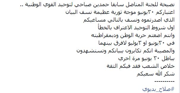 الكاتب الصحفي صلاح بديوي: “نصيحة للجنة المناضل سابقا حمدين صباحي لتوحيد القوى الوطنية: اعتباركم ٣٠ يونيو موجة ثورية عظيمة نسف البيان الذي أصدرتموه ونسف بالتالي مساعيكم، أول شروط التوحيد الاعتراف بالخطأ، وأنتم أضعتم حرية الوطن وديمقراطيته، في ٣٠ يونيو أو ٣ يوليو لا فرق بينهما، والمصيبة أنكم تكابرون ببيانكم وتستشهدون بباطل ٣٠ يونيو مرة أخرى، خلاص الشعب فقد فيكم الثقة، شكر الله سعيكم.