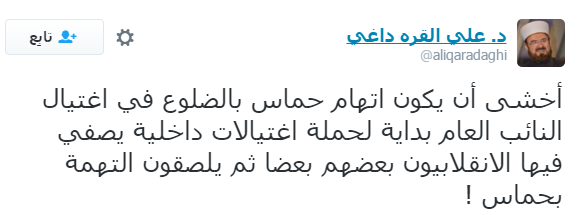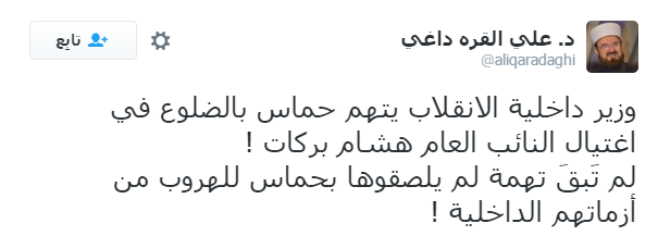 كما استنكر الدكتور علي القرة داغي الأمين العام للاتحاد العالمي لعلماء المسلمين، تصريحات وزير الداخلية اللواء مجدي عبدالغفار، الذي يتهم فيها حركة “حماس” بالمشاركة والتخطيط في حادث اغتيال النائب العام المصري هشام بركات.