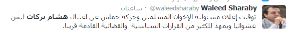 وكتب شرابي عبر تغريدة على حسابه الشخصي، بموقع التواصل الاجتماعي “تويتر”: “توقيت إعلان مسؤولية الإخوان المسلمين وحركة “حماس” عن اغتيال هشام بركات، ليس عشوائيًا، ويُمهد للكثير من القرارات السياسية والقضائية القادمة قريبًا”.