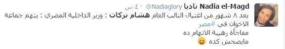 وكتبت “بعد ٨ شهور من اغتيال النائب العام هشام بركات، وزير الداخلية المصري يتهم جماعة الإخوان في مصر، مفاجأة رهيبة الاتهام ده ما يصحش كده”.