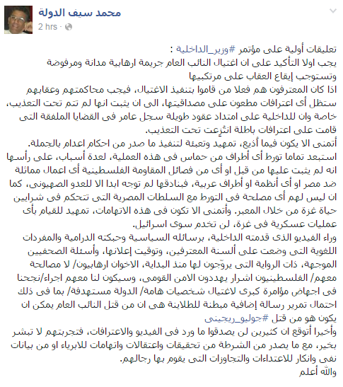 وكتب سيف الدولة عبر منشور له على حسابه بموقع التواصل الاجتماعي “فيس بوك”: “ستظل أي اعترافات مطعون على مصداقيتها، إلى أن يثبت أنها لم تتم تحت التعذيب، خاصة أن للداخلية على امتداد عقود طويلة سجلا عامرا في القضايا الملفقة التي قامت على اعترافات باطلة انتُزِعت تحت التعذيب”.