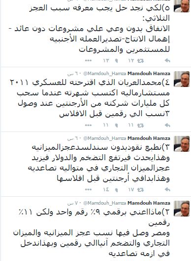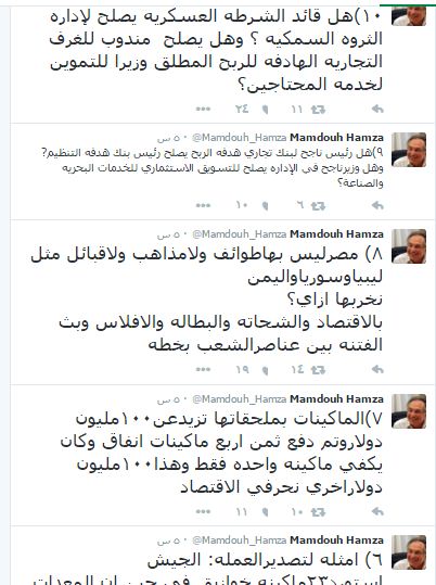تساءل “حمزة” -في نهاية تغريداته-: “هل رئيس ناجح لبنك تجاري هدفه الربح يصلح رئيس بنك هدفه التنظيم؟ وهل وزير ناجح في الإدارة يصلح للتسويق الاستثماري للخدمات البحرية والصناعة؟.. هل قائد الشرطة العسكرية يصلح لإدارة الثروة السمكية؟ وهل يصلح مندوب للغرف التجارية الهادفه للربح المطلق وزيرًا للتموين لخدمة المحتاجين؟”.