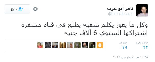 وأضاف -عبر “فيس بوك”- “كل ما يعوز يكلم شعبه يطلع في قناة مشفرة اشتراكها السنوي 6 آلاف جنيه”.