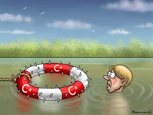 وعن اتفاقات تركيا المشبوهة مع الاتحاد الأوروبي بشأن تدفق اللاجئين، نشر موقع “بولتيكال كارتونز” هذا الرسم:
