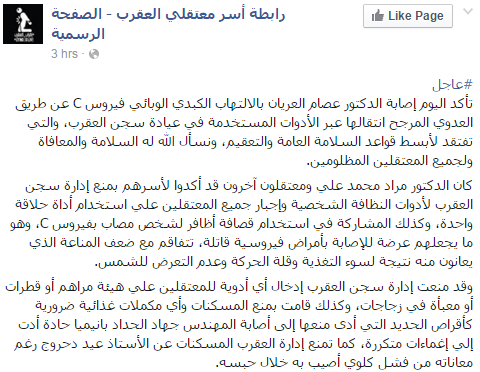 واستشهدت الصفحة بتصريح نُسب إلى المتحدث الإعلامي باسم حزب الحرية والعدالة الدكتور مراد علي، المسجون داخل سجن العقرب، أشار فيه إلى حجب إدارة السجن أدوات النظافة الشخصية عن المعتقلين، وإجبار جميع المعتقلين على استخدام أداة حلاقة واحدة، وقصافة أظافر لشخص مصاب بفيروس C.