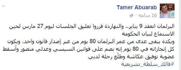 قال الكاتب الصحفي تامر أبوعرب: مر 80 يوما من عمر مجلس النواب، لم يصدر فيها أي قوانين غير إقرار القوانين التي أصدرها عبدالفتاح السيسي وعدلي منصور.