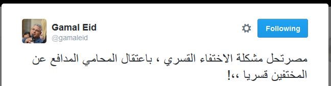 وقال عيد فى تغريدته: “إن مصر توصلت إلى حل مشكلة المختفين قسريًا، بالقبض على المحامين المدافعين عنهم”.