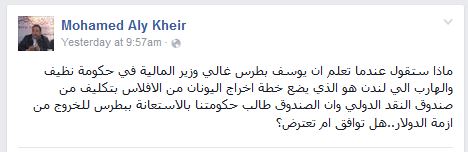 نشر الصحفي محمد علي خير، تعليقا أكدد فيه أن صندوق النقد الدولي طلب من مصر الاستعانة بوزير ماليتها الأسبق الهارب بطرس غالي للخروج من أزمة الدولار، وذلك من خلال صفحته الشخصية بموقع التواصل الاجتماعي “فيس بوك”.