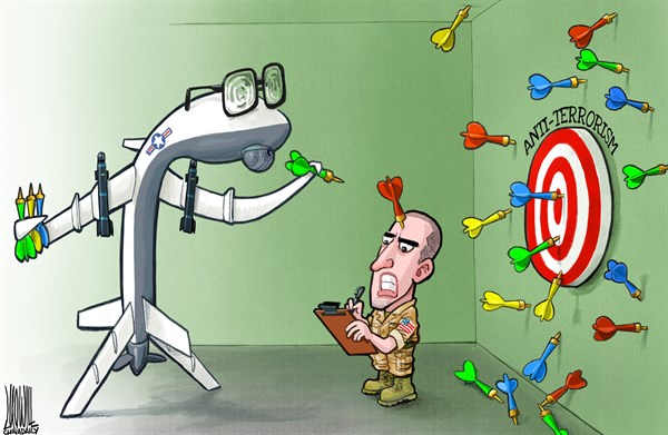 وعن سوء الاستهداف الأميركي للإرهاب في العالم، نشر موقع “بولتيكال كارتونز” الرسم التالي: