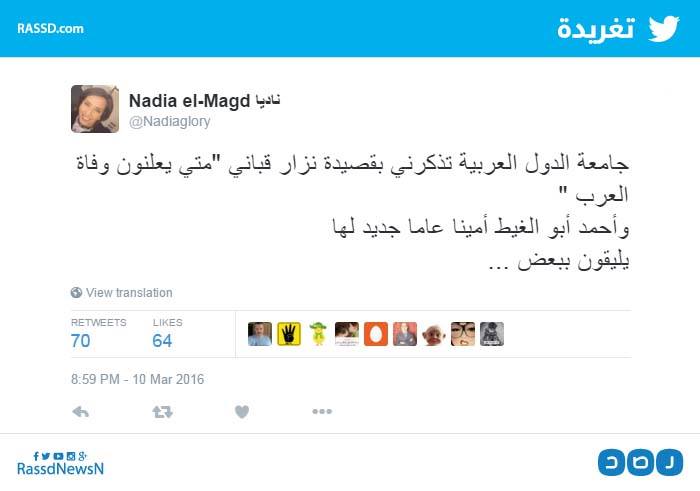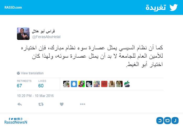 واعتبر البرلماني السابق، حاتم عزام، اختيار أبو الغيط، نتاجًا طبيعيًا للواقع العربي وشعارًا للمرحلة وخير من يمثلها، وتذكرت الإعلامية، ناديا أبو المجد، قصيدة نزار قباني “متى يعلنون وفاة العرب”.