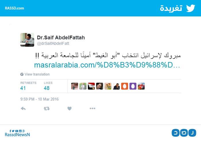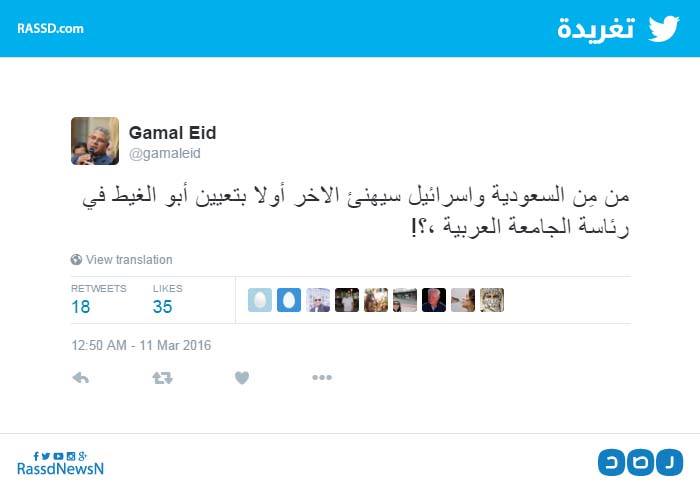 وحمَّل المحامي الحقوقي، جمال عيد، السعودية مسؤولية الاختيار، متسائلًا: “من مِن السعودية وإسرائيل سيهنئ الآخر أولًا بتعيين أبو الغيط؟”، فيما وجه الأكاديمي والسياسي “سيف الدين عبدالفتاح” المباركة لـ”إسرائيل”.