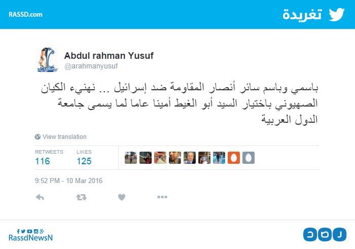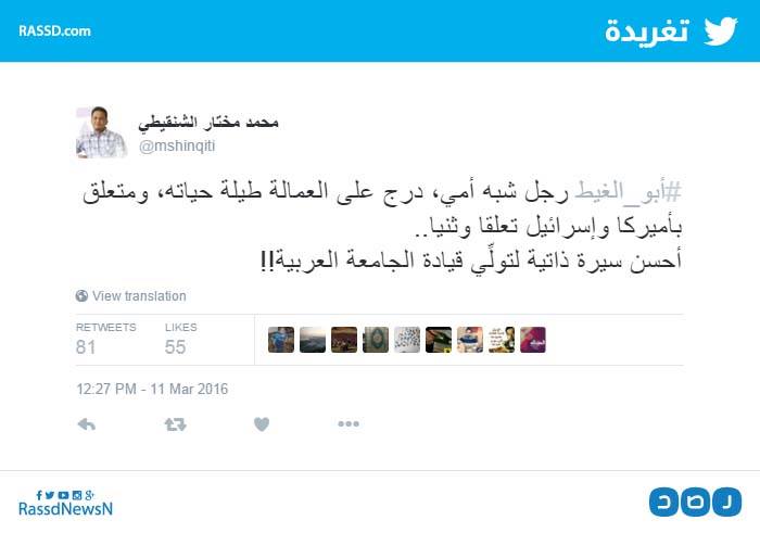 بداية، وجَّه الشاعر والكاتب الصحفي، عبدالرحمن يوسف، التهنئة باسمه وباسم سائر أنصار المقاومة ضد “إسرائيل”، للكيان الصهيوني باختيار الأمين الجديد لجامعة الدول، وتبعه بالسخرية محمد مختار الشنقيطي، أستاذ الأخلاق السياسية وتاريخ الأديان بكلية قطر للدراسات الإسلامية، قائلًا: إن أبو الغيط رجل شبه أمي، درج على العمالة طيلة حياته”.