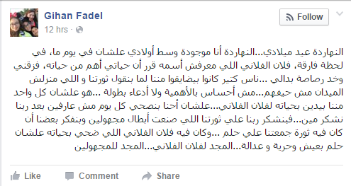 وكتبت “فاضل” -عبر صفحتها على موقع التواصل الاجتماعي “فيس بوك”- منشورًا عبرت فيه عن امتنانها لشخص مجهول تلقى رصاصة في ميدان التحرير 2011، بدلًا منها، قائلة: “النهارده عيد ميلادي… النهارده أنا موجودة وسط أولادي علشان في يوم ما، في لحظة فارقة، فلان الفلاني اللي معرفش اسمه، قرر أن حياتي أهم من حياته، فزقني وخد رصاصة بدالي”.