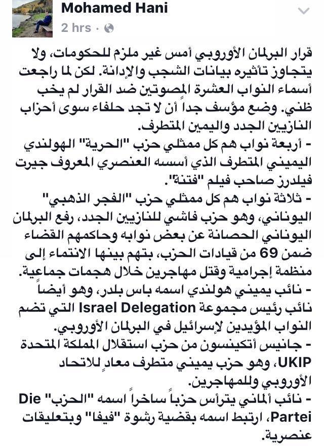 وقال هاني في منشور له على صفحته بموقع التواصل الاجتماعي “فيسبوك” : ” لما راجعت أسماء النواب العشرة المصوتين ضد القرار، لم يخب ظني، وضع مؤسف جدًا أن لا تجد حلفاء سوى النازيين الجدد واليمين المتطرف”.