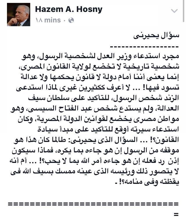 وقال حسني عبر منشور على “فيس بوك”، تحت عنوان “سؤال يحيرني”: مجرد استدعاء وزير العدل لشخصية الرسول، وهو شخصية تاريخية لا تخضع لولاية القانون المصري، إنما يعني أننا أمام دولة لا قانون يحكمها ولا عدالة تسود فيها!.