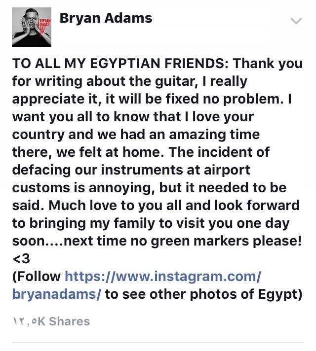 شكر المغني العالمي “براين آدمز”، المصريين الذين تعاطفوا معه بعد أن قام موظف جمارك مصري بالكتابة على الجيتار التاريخي الخاص به.