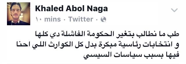 وغرد قائلا “طب ما نطالب بتغيير الحكومة الفاشلة، وانتخابات رئاسية مبكرة، بدل كل الكوارث اللي احنا فيها بسبب سياسات السيسي”.