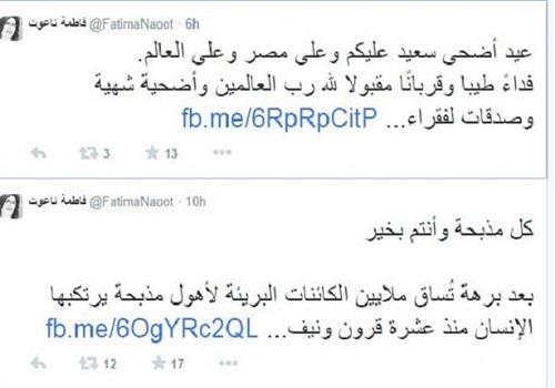 وكانت “ناعوت” قد قالت عن هذه المناسبة الدينية: “”كل مذبحة وأنتم بخير.. بعد برهة تُساق ملايين الكائنات البريئة لأهول مذبحة يرتكبها الإنسان منذ عشرة قرون ونيف”، مضيفة: ”عيد أضحى سعيد عليكم وعلى مصر وعلى العالم.. فداءً طيبًا وقربانًا مقبولًا لله رب العالمين وأضحية شهية وصدقات للفقراء”.