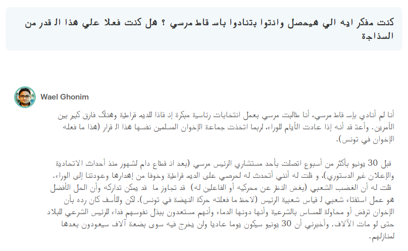 و أكد الناشط السياسي وائل غنيم، أنه لم يطالب بإسقاط الرئيس محمد مرسي، بل طالب بضرورة إجراء انتخابات رئاسية مبكرة إنقاذا للديمقراطية، على غرار ما قامت به تونس، مشددا على أن الفرق كبير بين الأمرين، وأنه إذا عادت الأيام للوراء كان الإخوان المسلمون أنفسهم سيتخذون هذا القرار، على حد تعبيره.