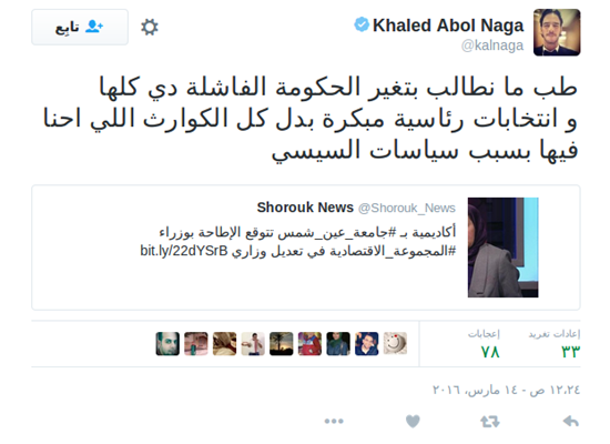 يقول الفنان خالد أبوالنجا، عبر“تويتر”: “طب ما نطالب بتغيير الحكومة الفاشلة دي كلها وانتخابات رئاسية مبكرة بدل كل الكوارث اللي احنا فيها بسبب سياسات السيسي”.