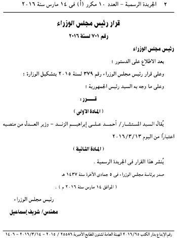 نشرت الجريدة الرسمية قرار رئيس مجلس الوزراء المهندس شريف إسماعيل، رقم 701 لسنة 2016، بإقالة المستشار أحمد الزند وزير العدل من منصبه اعتبارا من يوم 13-3- 2016.