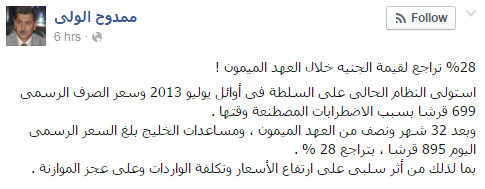 وعلق الخبير الاقتصادي ممدوح الولي على تراجع قيمة الجنيه أمام الدولار بقوله: “28% تراجعا لقيمة الجنيه خلال العهد الميمون”.