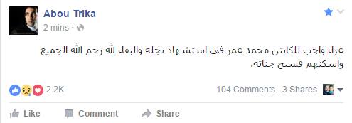 وكتب “أبو تريكة” -عبر حسابه على “تويتر”-: “عزاء واجب للكابتن محمد عمر في استشهاد نجله والبقاء لله، رحم الله الجميع وأسكنهم فسيح جناته”.