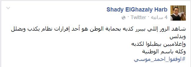 وقال -عبر منشور له على “فيس بوك”-: “شاهد الزور اللي بيبرر كذبه بحماية الوطن هو أحد إفرازات نظام يكذب ويضلل ويدلس، وإعلاميين بيطبلوا لكذبه، وكله باسم الوطنية”.