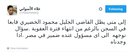 تساءل الكاتب والروائي علاء الأسواني، عن أسباب بقاء المستشار محمود الخضيري في السجن بالرغم من انتهاء فترة عقوبته.