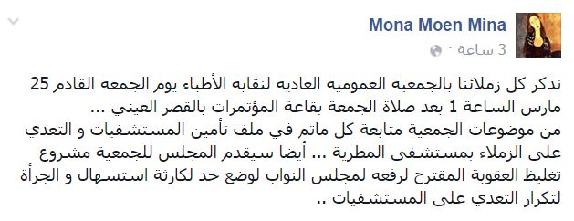 ودعت -عبر منشور لها على “فيس بوك”- كل الأطباء لحضور الجمعية العمومية العادية لنقابة الأطباء، يوم الجمعة القادم 25 مارس الساعة 1 بعد صلاة الجمعة، بقاعة المؤتمرات بقصر العيني.