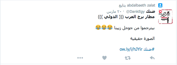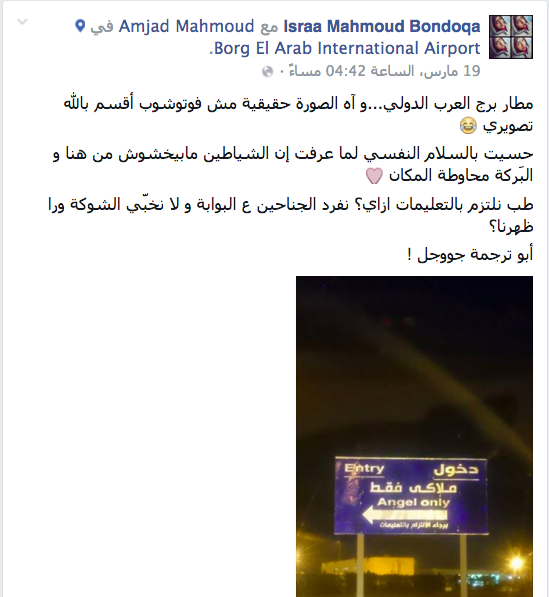 سخر رواد مواقع التواصل الاجتماعي، من صورة التقطها أحد رواد “فيس بوك”، للافتة مترجمة للإنجليزية بمطار برج العرب بالإسكندرية.