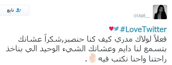 -Uqiil: “فعلًا لولاك مدري كيف كنا حنصبر.. شكرًا عشانك بتسمع لنا دايم وعشانك الشيء الوحيد اللي بناخذ راحتنا واحنا نكتب فيه شكرًا لـ تويتر وللأوفياء”.