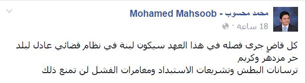 وقال -عبر منشور له على “فيس بوك”-: “كل قاضٍ جرى فصله في هذا العهد سيكون لبنة في نظام قضائي عادل لبلد حر مزدهر وكريم”.