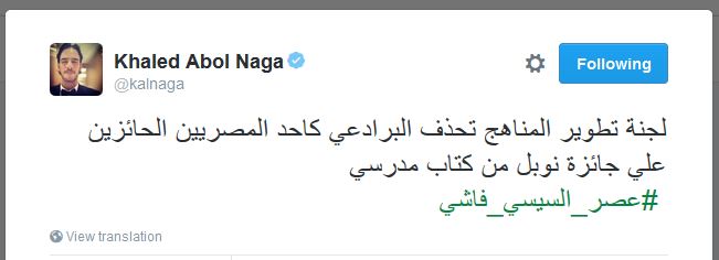 وأشار أبوالنجا إلى أن حذف لجنة تطوير المناهج الدكتور محمد البرادعي من المناهج الدراسية، شاهد على عصر السيسي الفاشي.